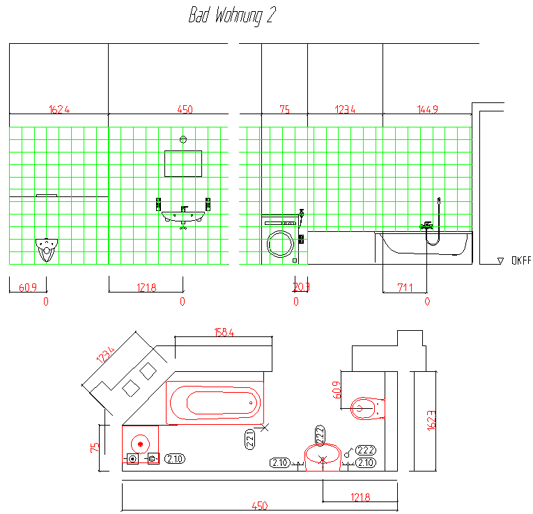 am Beispiel einer Badplanung im Gebäudebestand. Alle Objekte im Fliesenraster positioniert. Bewegungsflächen nach DIN.
